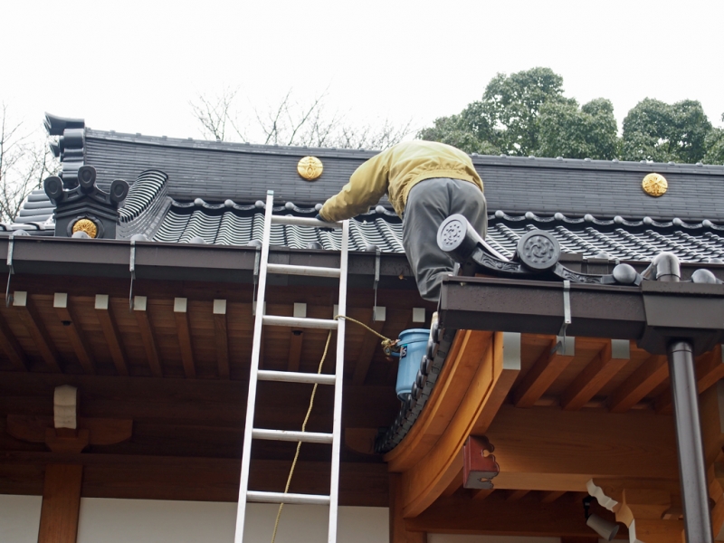 それと今年から実にやっかいな作業が始まりました。それは本堂大屋根の前面に取り付けてある雨といの掃除です。目の前に巨大な銀杏がそびえる光明寺ですから、これはもう避けては通れません。大量の落ち葉ですぐに詰まるのはわかっていても、正面だけは設置しない訳にも行きませんでした。当然、定期的な清掃が必要になります。これはもう税金みたいなものですね。おまけに、この作業が想像以上に大変です。なぜならとても高い場所での作業になるからで、素人には困難です。幸いなことに山寺には山師の哲ちゃん(責任総代の岩本哲夫さん)がいますから(?)なんとかなります。自前の長いハシゴを運んできて、雨といに積もったイチョウの葉っぱを取り除いてもらいました。これって、けっこう危険な作業です。とりわけ今年は雨天だったからリスクが高い。「あぶないから無理したらいけんよー」って、ハシゴを支える我々は下から声をかけるのですが、ご本人は「世話ーないやー」などと全然へっちゃらです。奥さんも「言ったって聞きゃしないから、好きにさせたらいいんよ」なんて、実にあっさりしたものであります。そんな調子で少々強引にやっちゃいましたが、我々はドキドキでしたね。ご本人は高い所での作業に慣れている人ですから、まあ大丈夫なんでしょうが、来年からは高所作業車を借りてきて安全な作業を心がけないといけませんね。