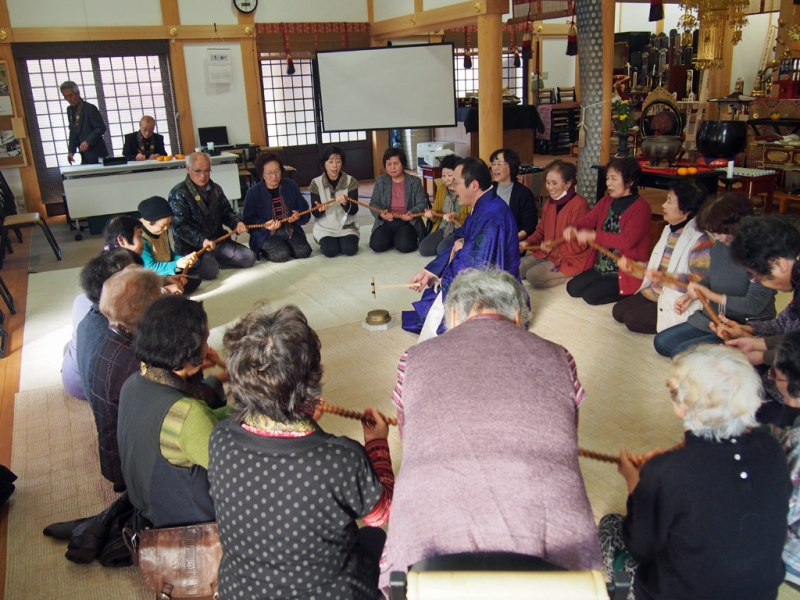 振り返るとH24年の御忌会は旧本堂で最後の開催でした。その時は組寺の舜青寺住職にお説教をして頂き全員で見事な寒行をしたものです。H25年は本堂の建替中なので未開催で、新本堂になって最初の御忌会となった昨年は私が少々お説教(記念講演?)をしたのですが、何をしゃべったのかちっとも思い出せません。今年はいっちょ奮発して説教師をとも思ったのですが、結局昨年に引き続き私が適当におしゃべりをさせて頂きました。ただし、私にそうそう気の利いたお話(お説教)なんて出来ませんから、BS放送の録画(大原三千院さんの番組等)をプロジェクターで投影して、浄土教の声明(しょうみょう・お経に節をつけた仏教音楽)について、あれこれうんちくを披露したり、浄土教の弥陀三尊形式や阿弥陀経等について解説をしたりして時間を過ごしました。