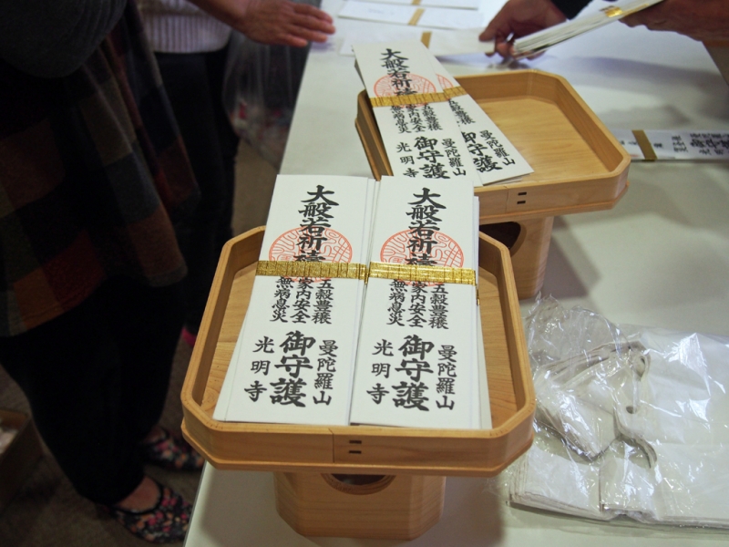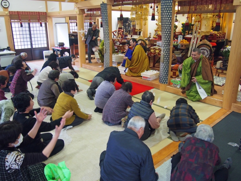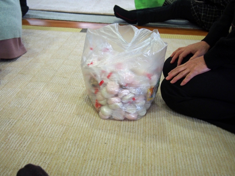 過去にはほとんど申し訳程度の時代もあったのですが、近年はみなさんがよくお参り下さるようになったので、まとまった枚数が出るようになりました。その売り上げ(くどいですが祈祷料ですね)で行事の予算に余裕が出るようになりました。それならば、みなさんにもっと喜んで頂けるようにと、今年はかなり大胆にまきもちの手配をしました。結果、山寺恒例の豆まきならぬ変則もちまきは、かつてないほどの超豪華版となりました。